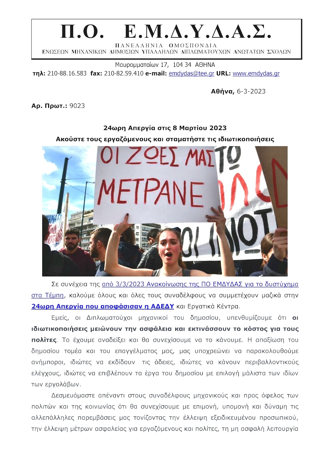 24ωρη Απεργία στις 8 Μαρτίου 2023 - Ακούστε τους εργαζόμενους και σταματήστε τις ιδιωτικοποιήσεις